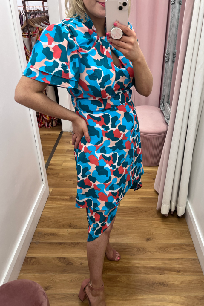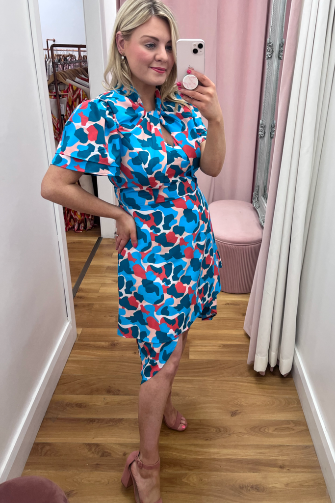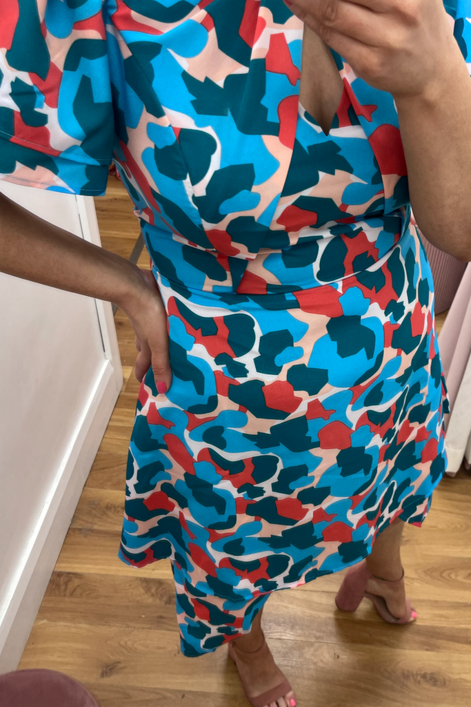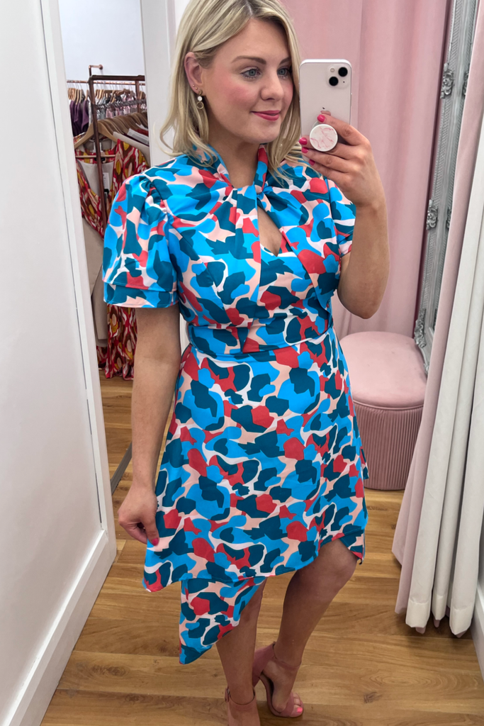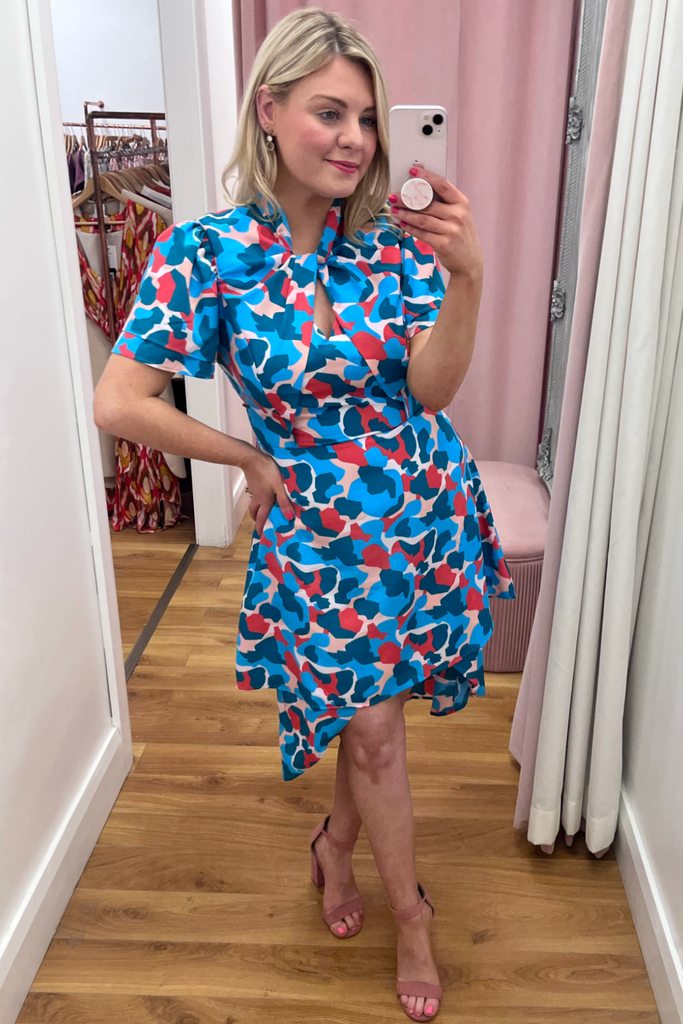 Striking abstract print dress in a mix of pink, red and blues. Features V-neckline, half sleeve, twisted neckline and dipped hemline at the back. With back zip fastening.