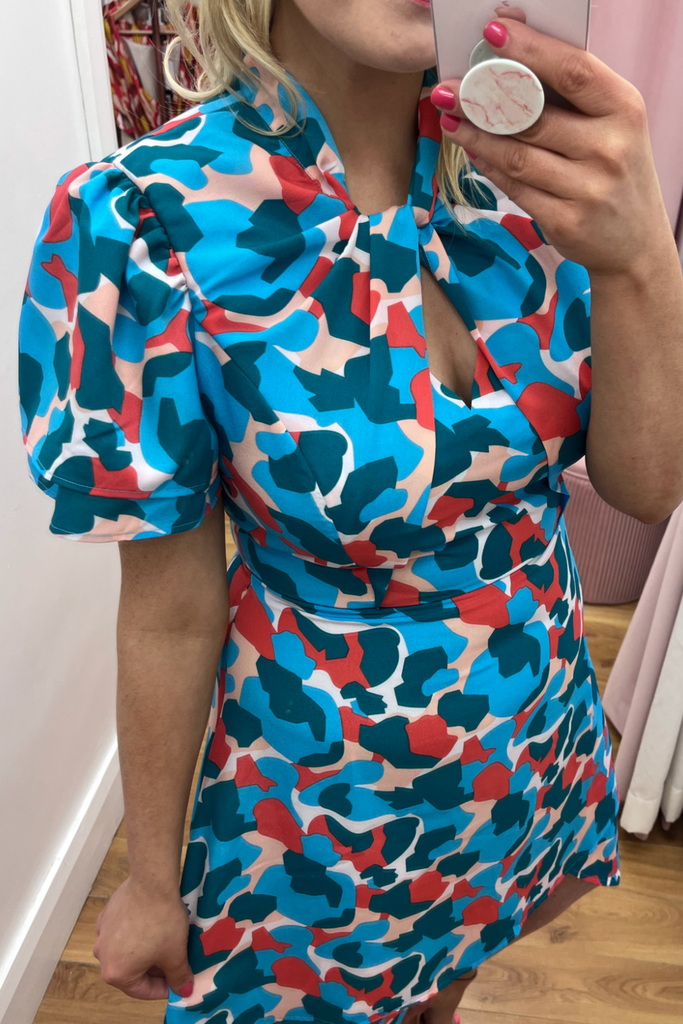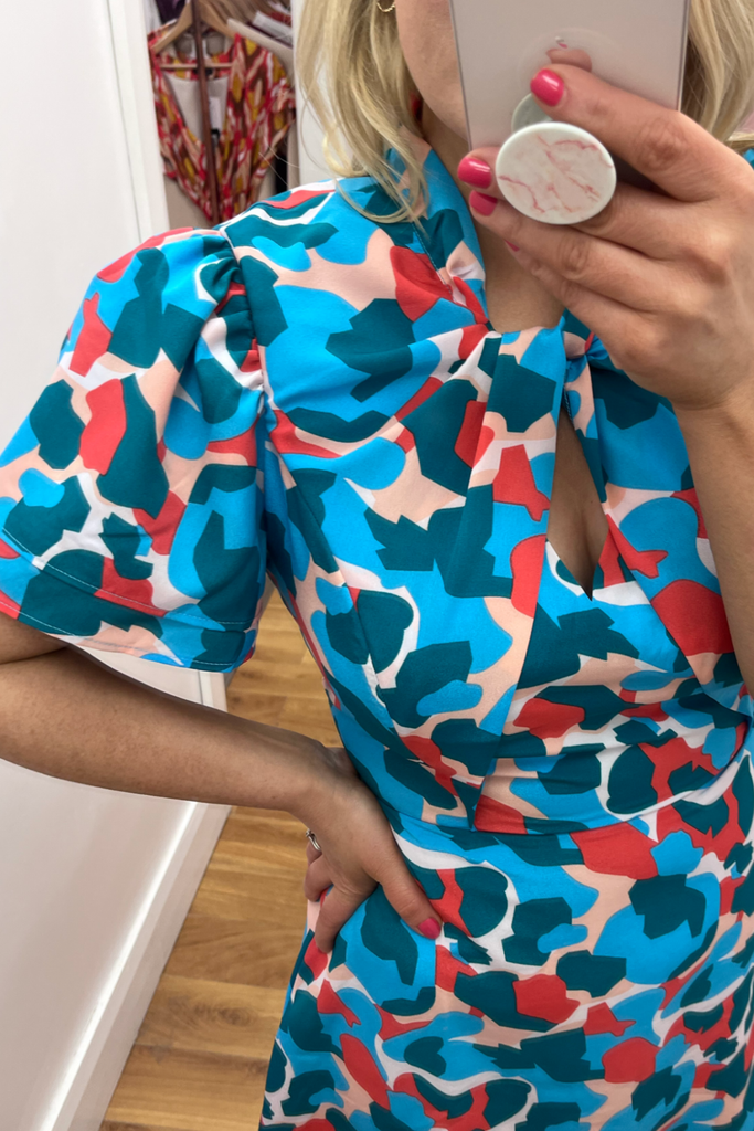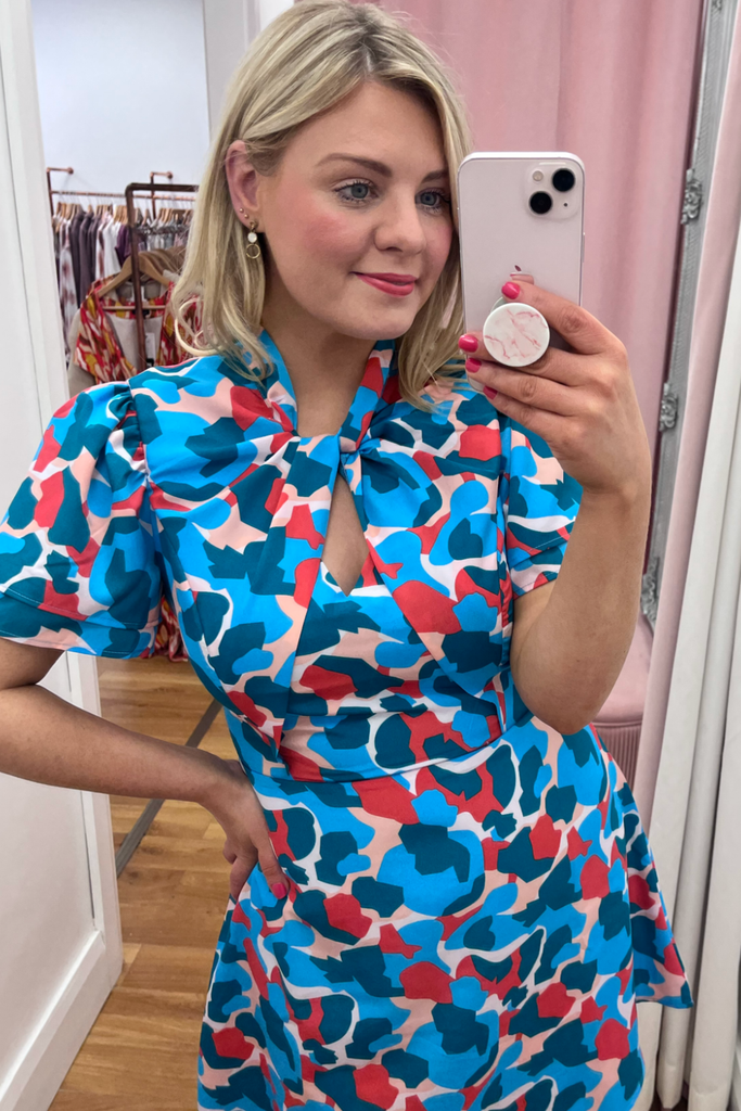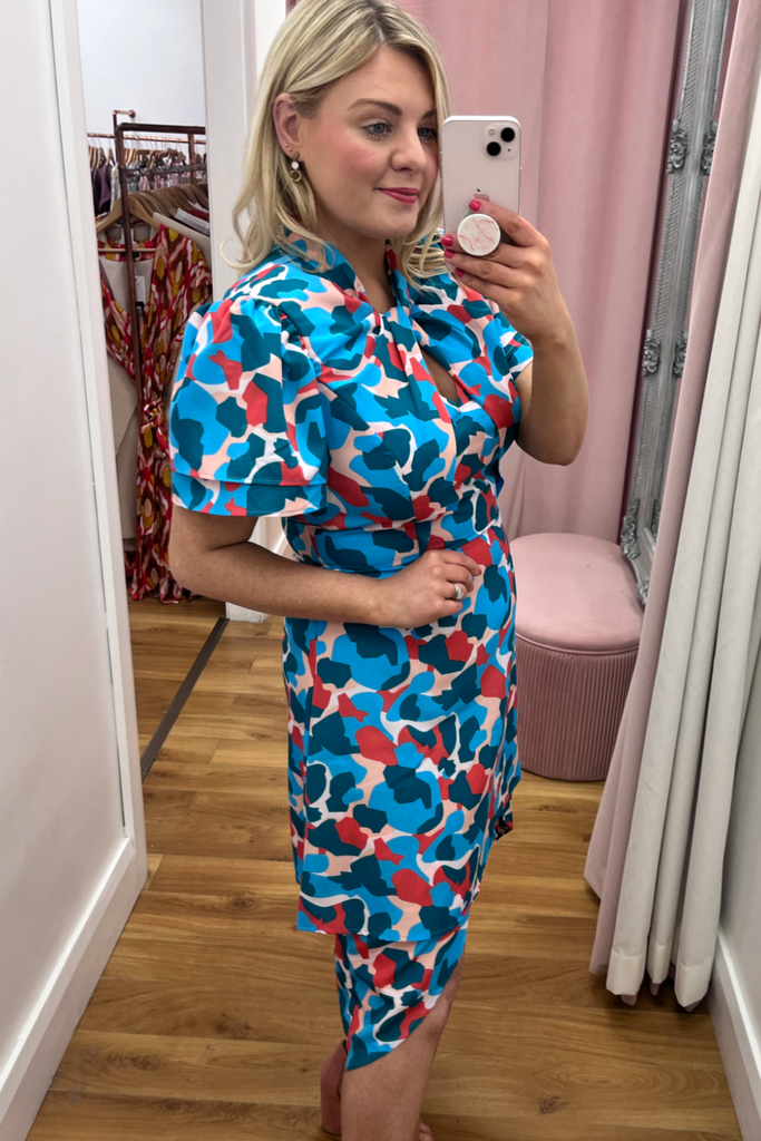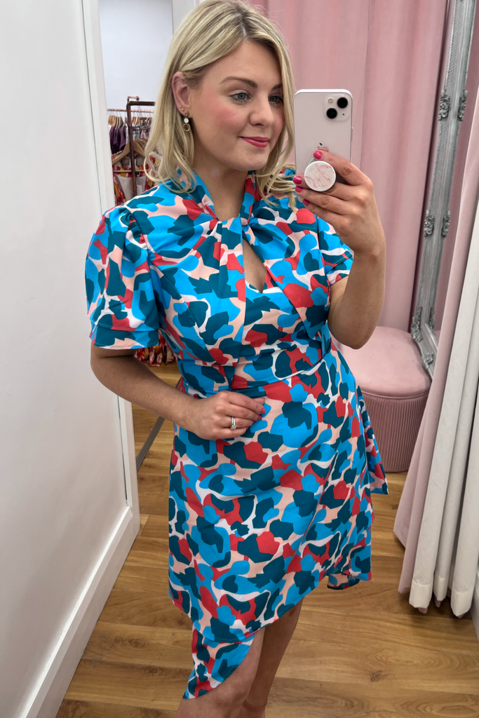 Striking abstract print dress in a mix of pink, red and blues. Features V-neckline, half sleeve, twisted neckline and dipped hemline at the back. With back zip fastening.