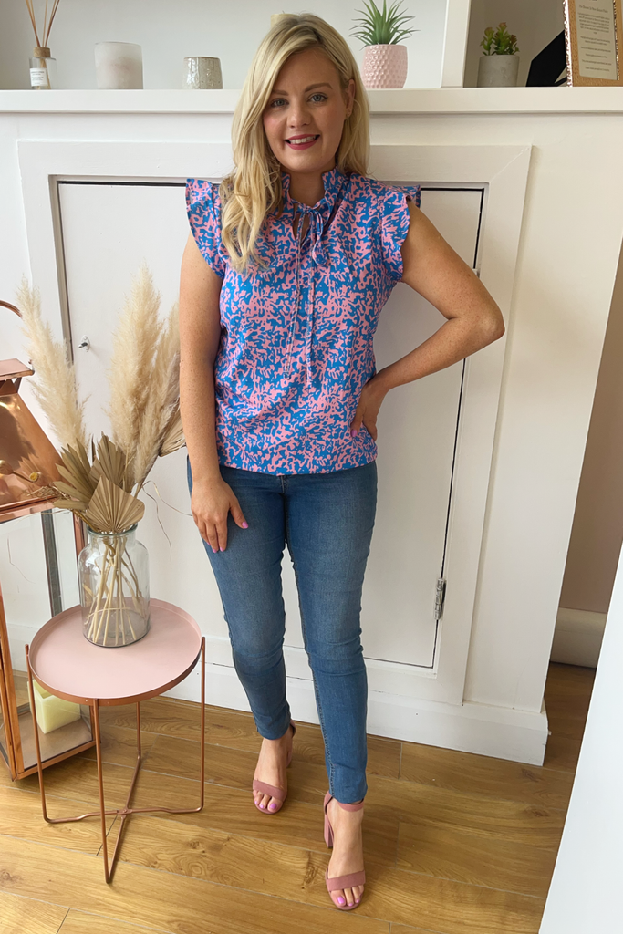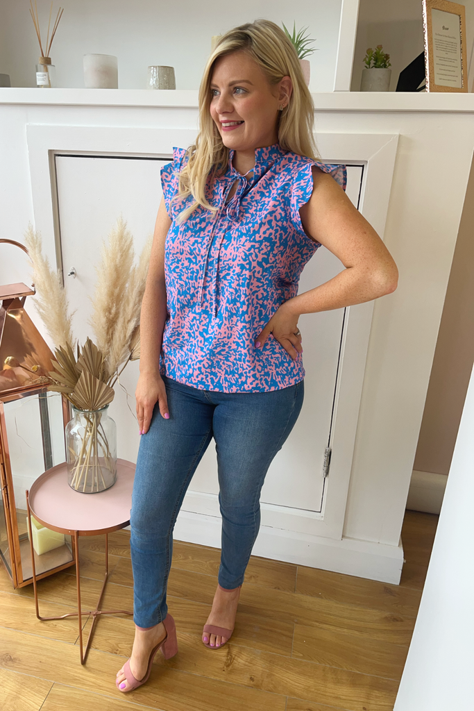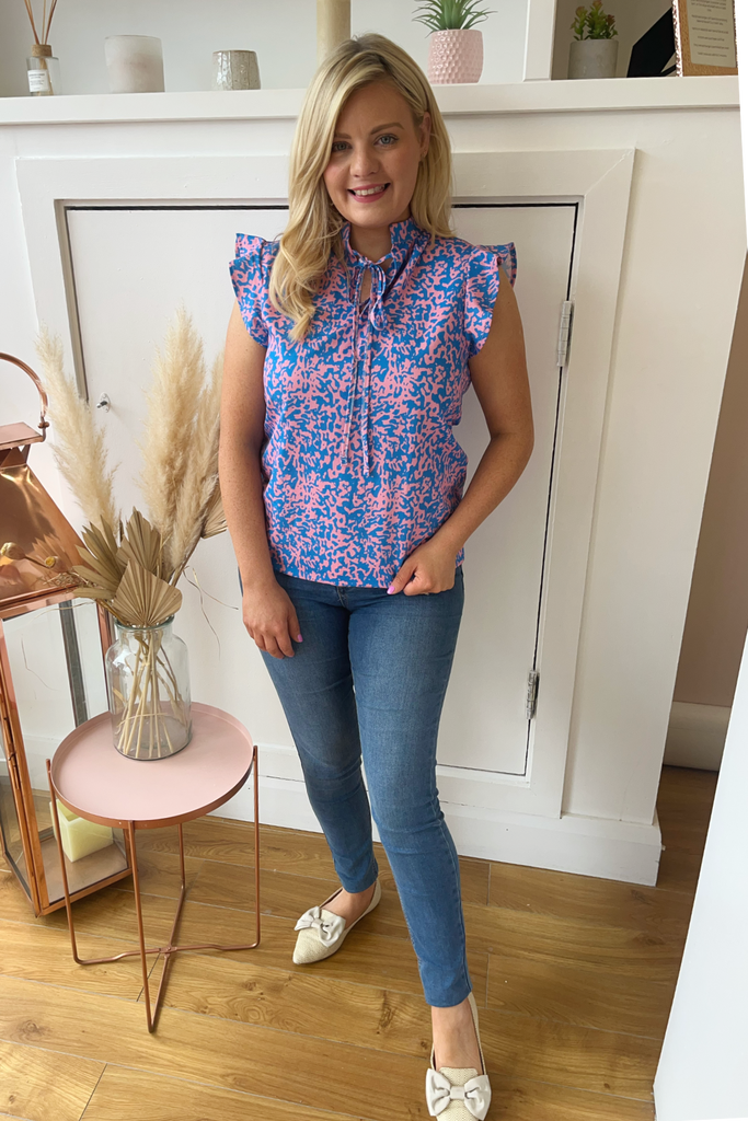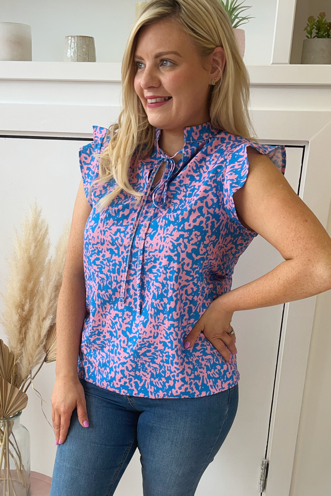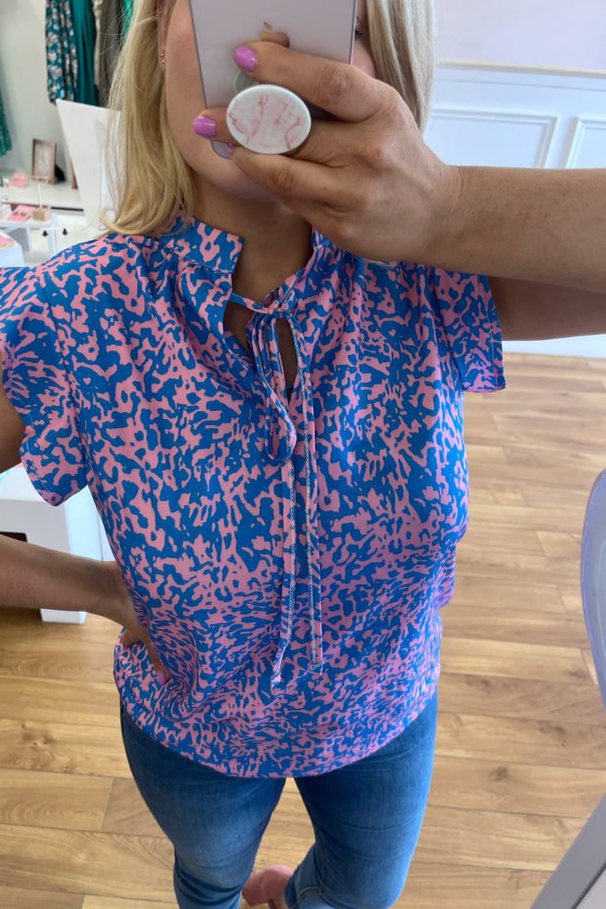 V-neck printed blouse in a pretty mix of pink and blue. Complete with ruffled cap sleeves, ruffled neckline, and neck tie with key-hole. So pretty and so comfortable, with great length and a silky feel.