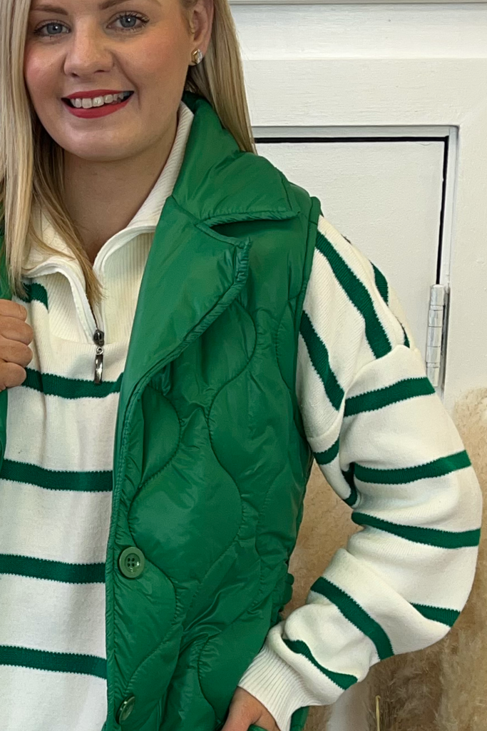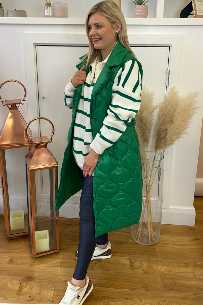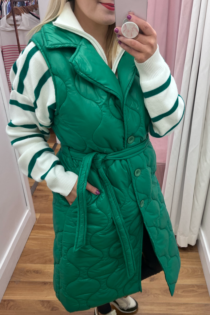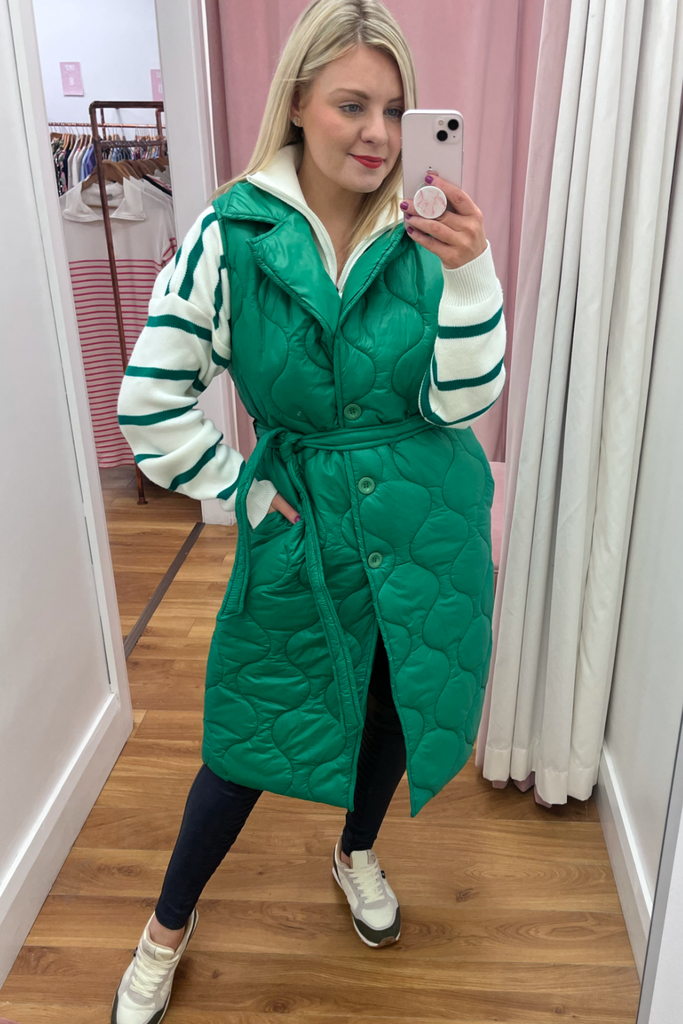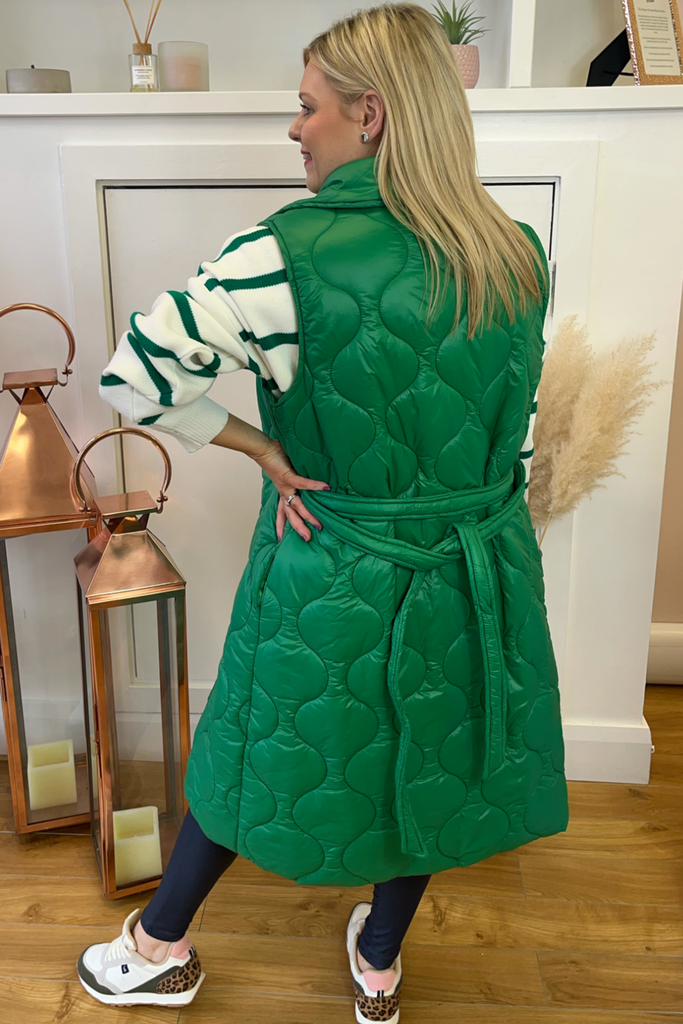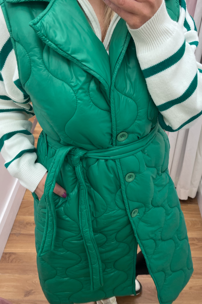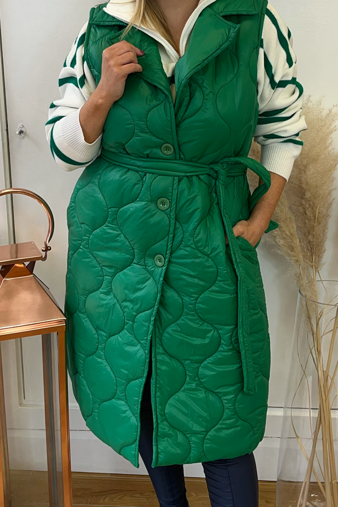 Light-medium weight quilted gilet in a mid-length with belt in an on-trend green with collar and pockets.