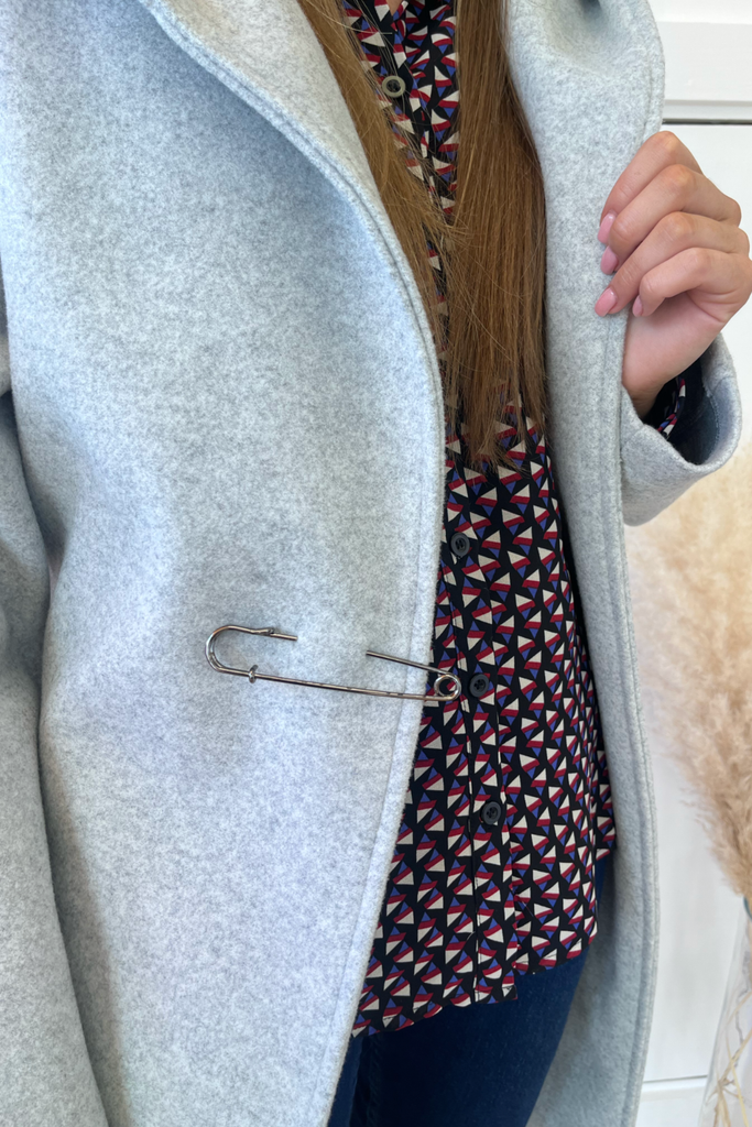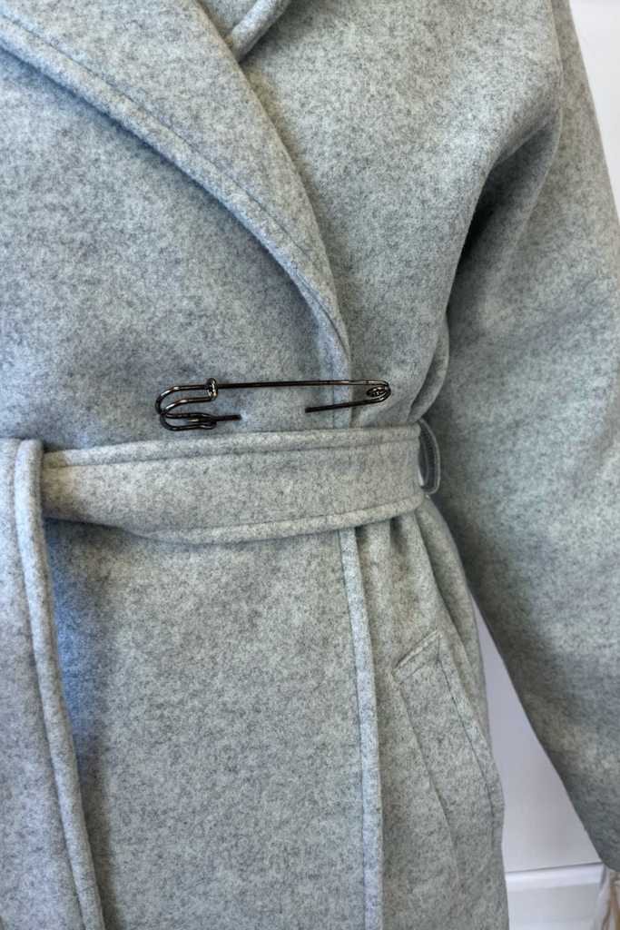 In a luxurious heavy weight, this wrap style coat is the perfect everyday to dressy coat. With hood, pockets and tie belt, with a decorative pin accessory at the front.