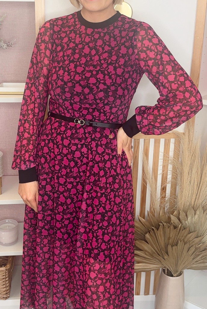 Chiffon style midi length dress with contrasting deep cuff, round neckline and matching belt