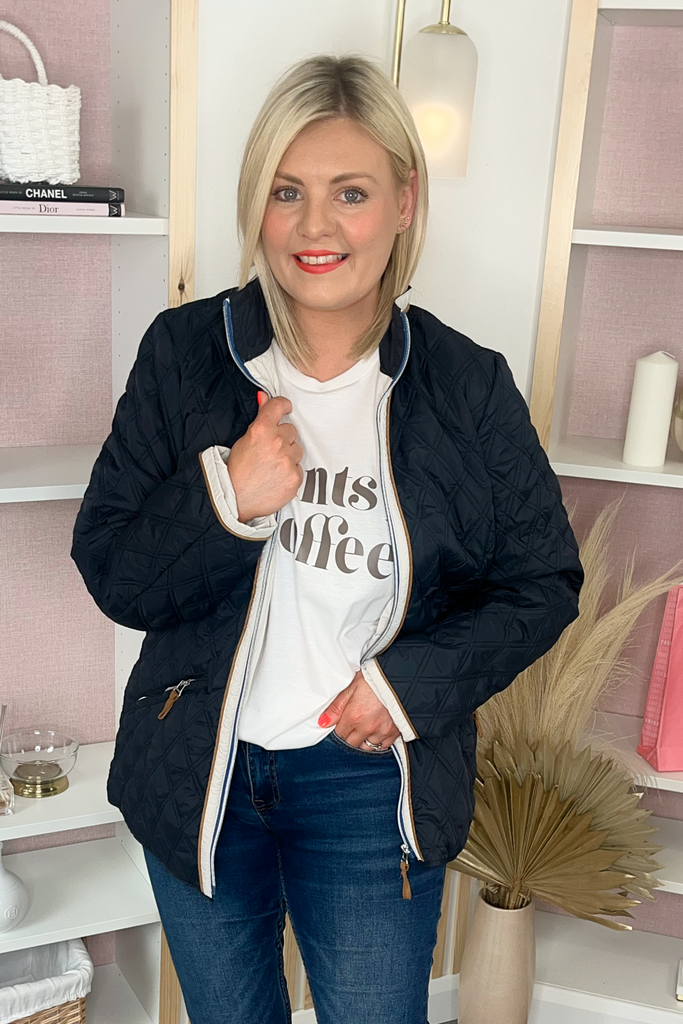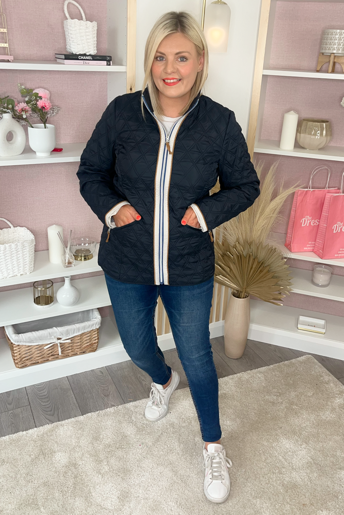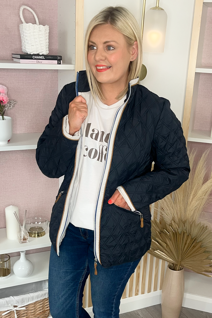 Diamond quilted mid-length jacket with contrasting trim on the cuffs and zip. This style is a mid-weight and super soft feel