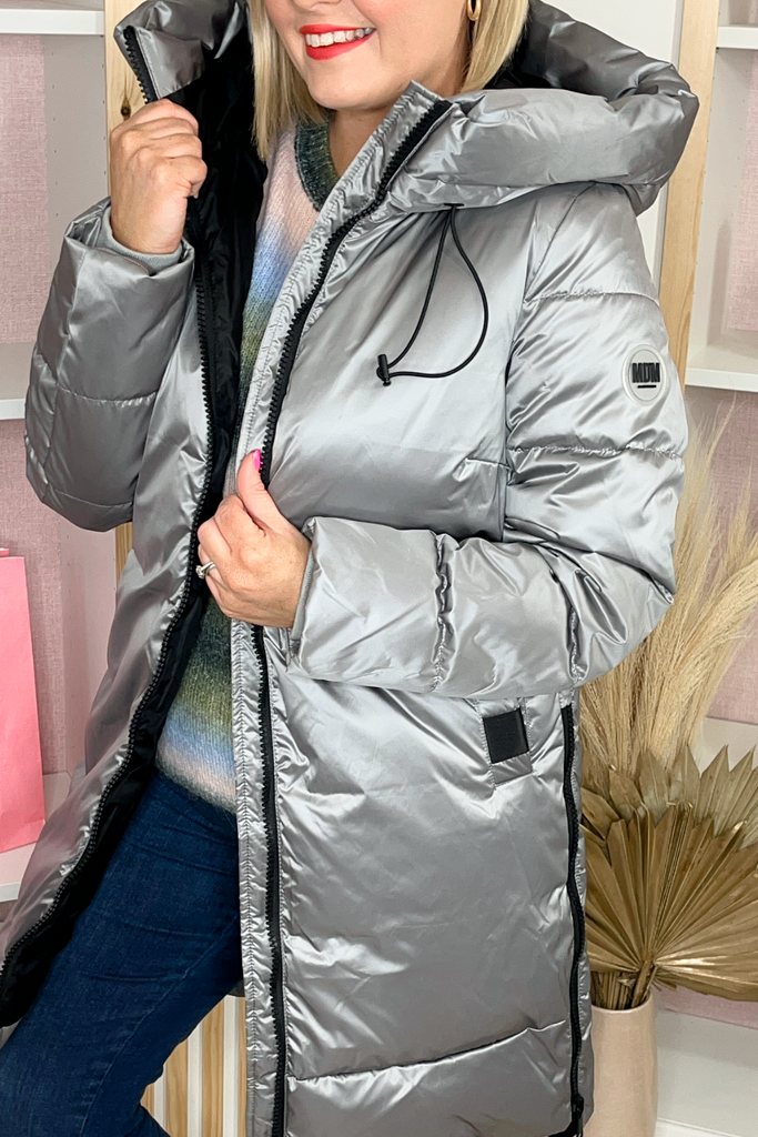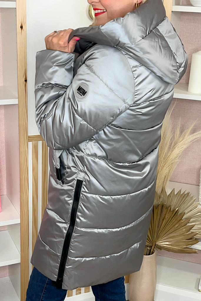 Quilted puffer coat with luxurious hood, contrasting black zips and side zip pockets. With adjustable zips on each side in a metallic platinum finish