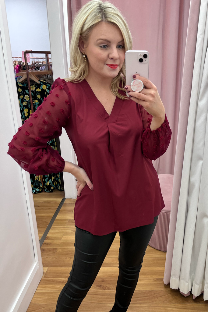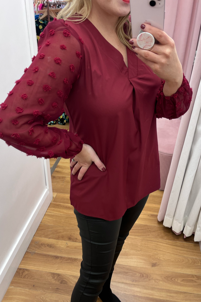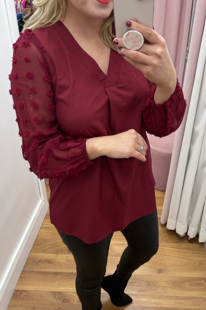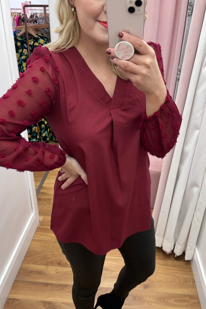 A rich burgundy blouse with lightweight woven fabric as it shapes a V-neckline and long sheer sleeves with polka dot and elastic cuffs which stop above the wrist. Pair with denims, leather looks or skirts.