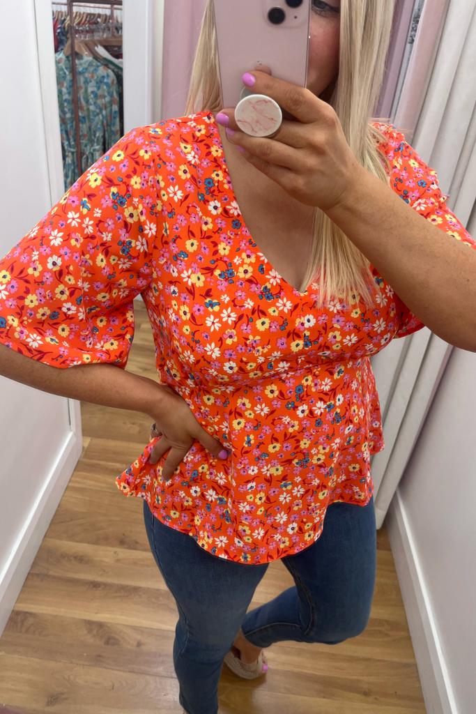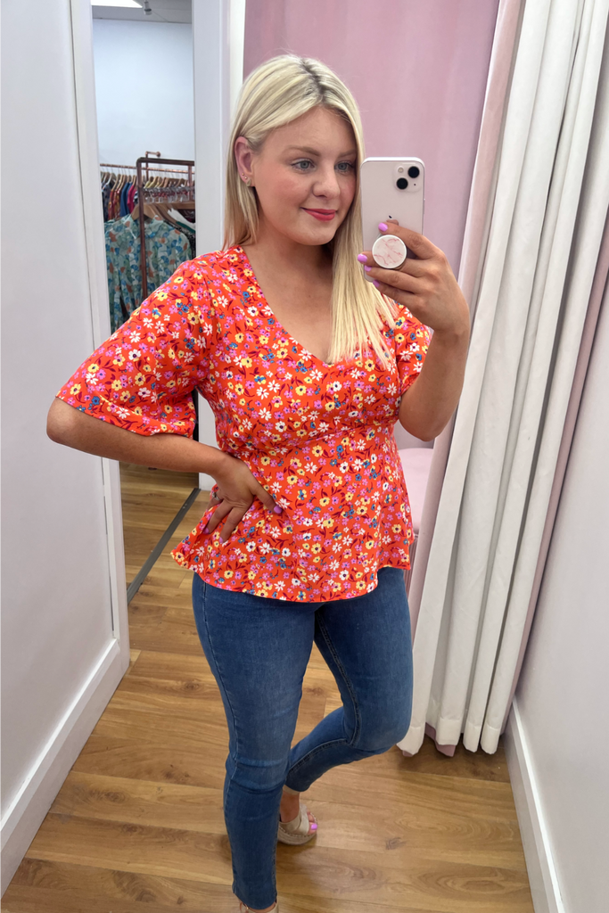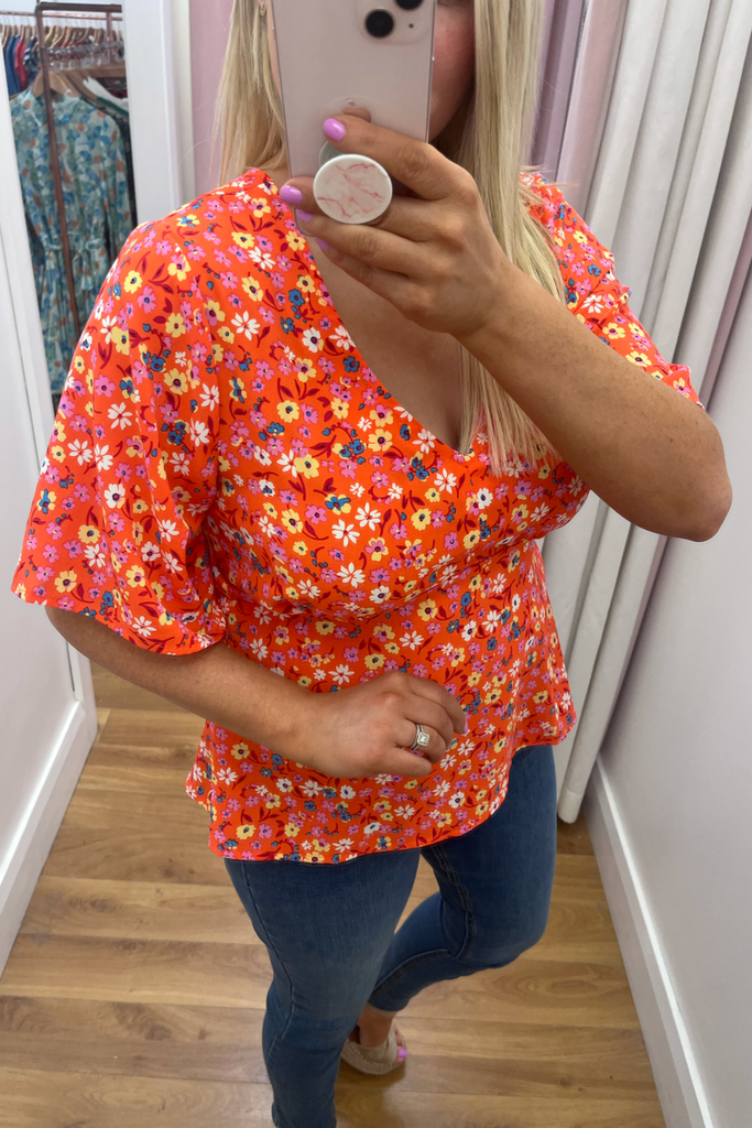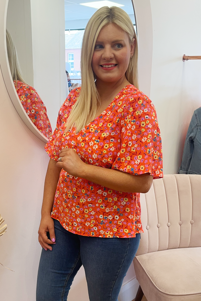 V-neck blouse with fitted waist that sculpts under the bust, and comfortable fit on the body. It has a floaty half sleeve and square cut-out back. On an orange base with multi-coloured ditsy floral.