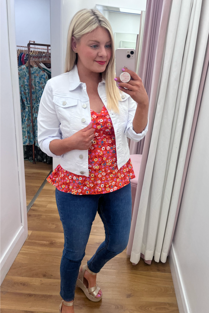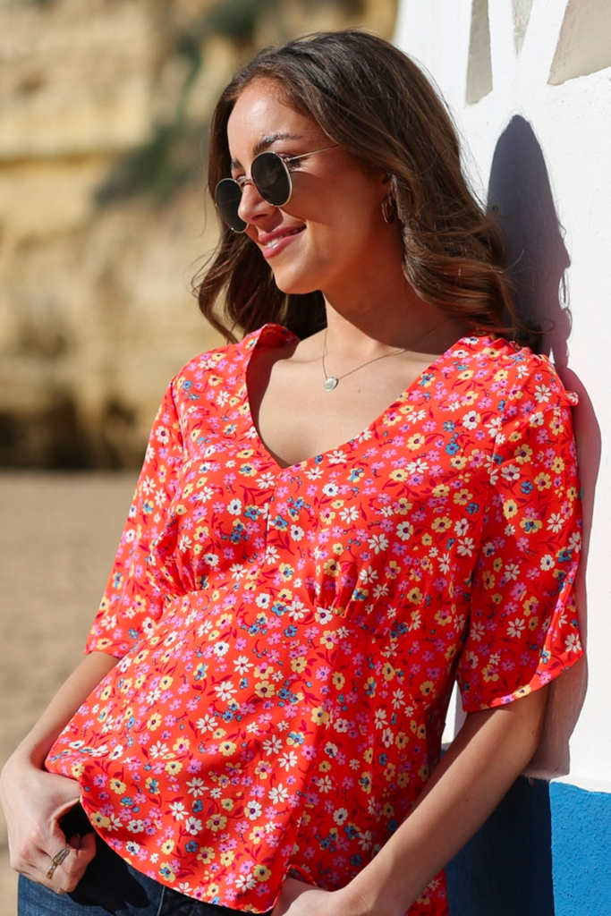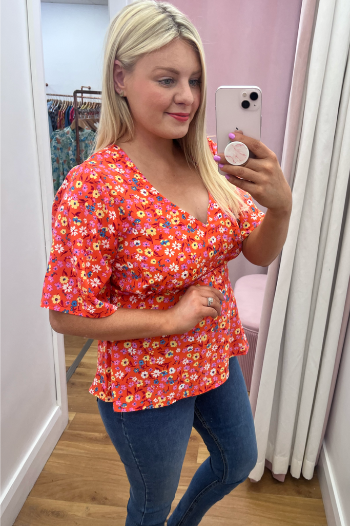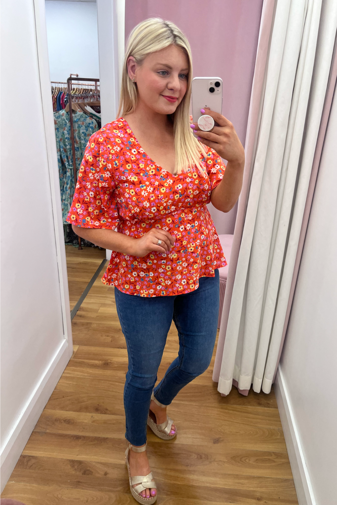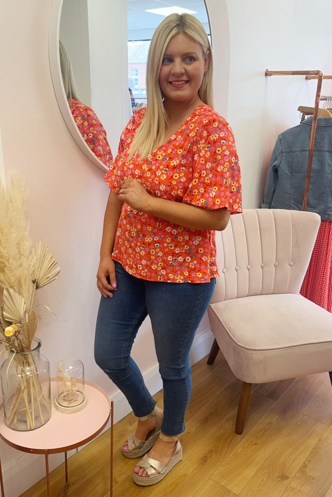 V-neck blouse with fitted waist that sculpts under the bust, and comfortable fit on the body. It has a floaty half sleeve and square cut-out back. On an orange base with multi-coloured ditsy floral.