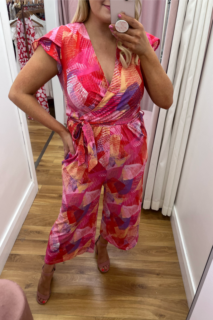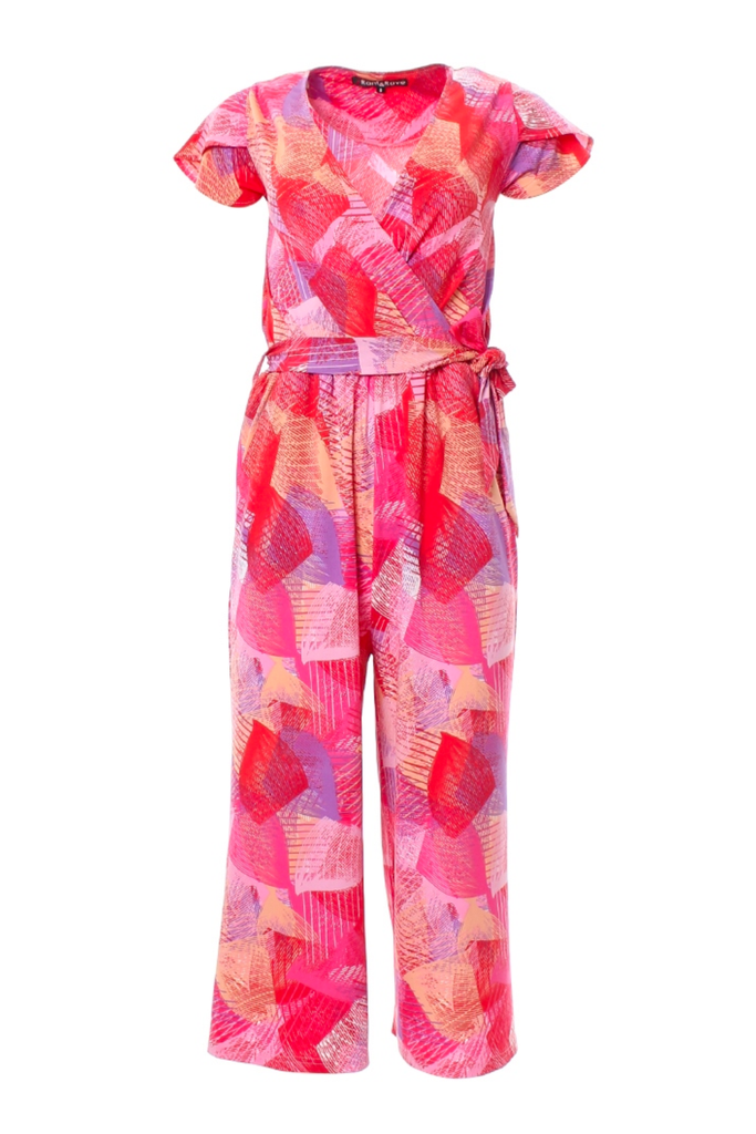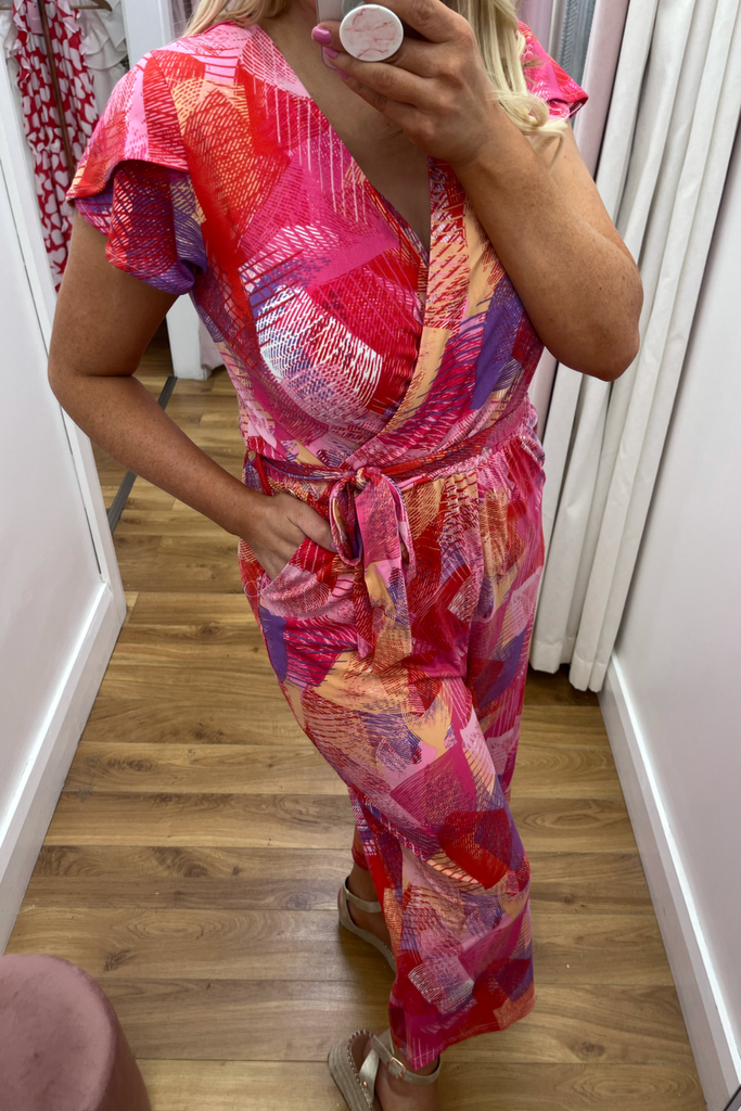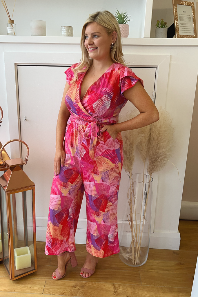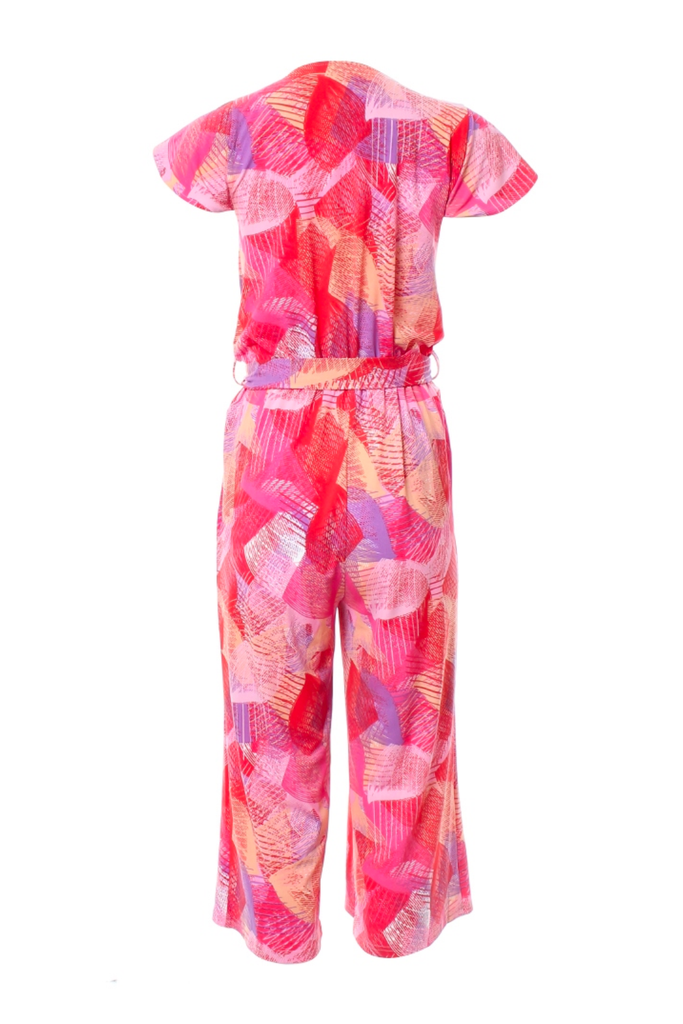Pink and red floral jumpsuit with cropped wide leg, wrap style top and half sleeve. This style has a matching material belt.