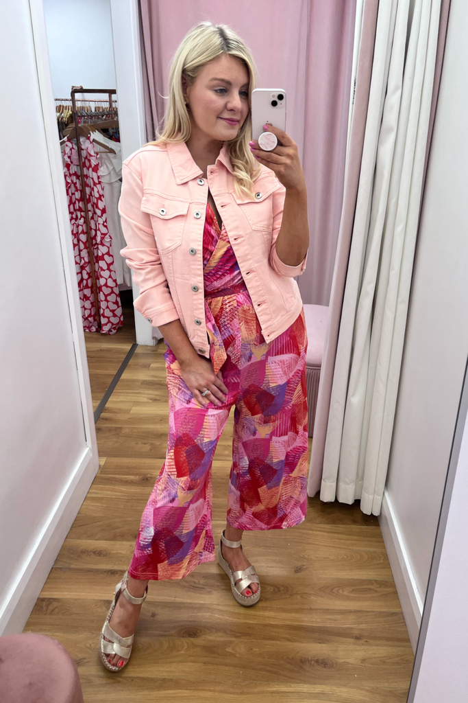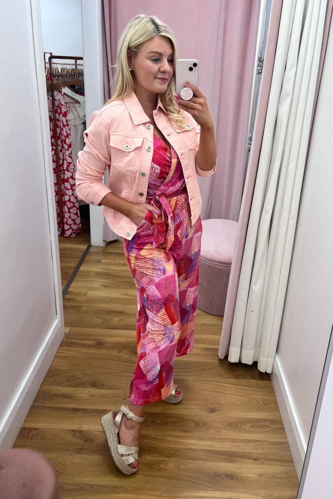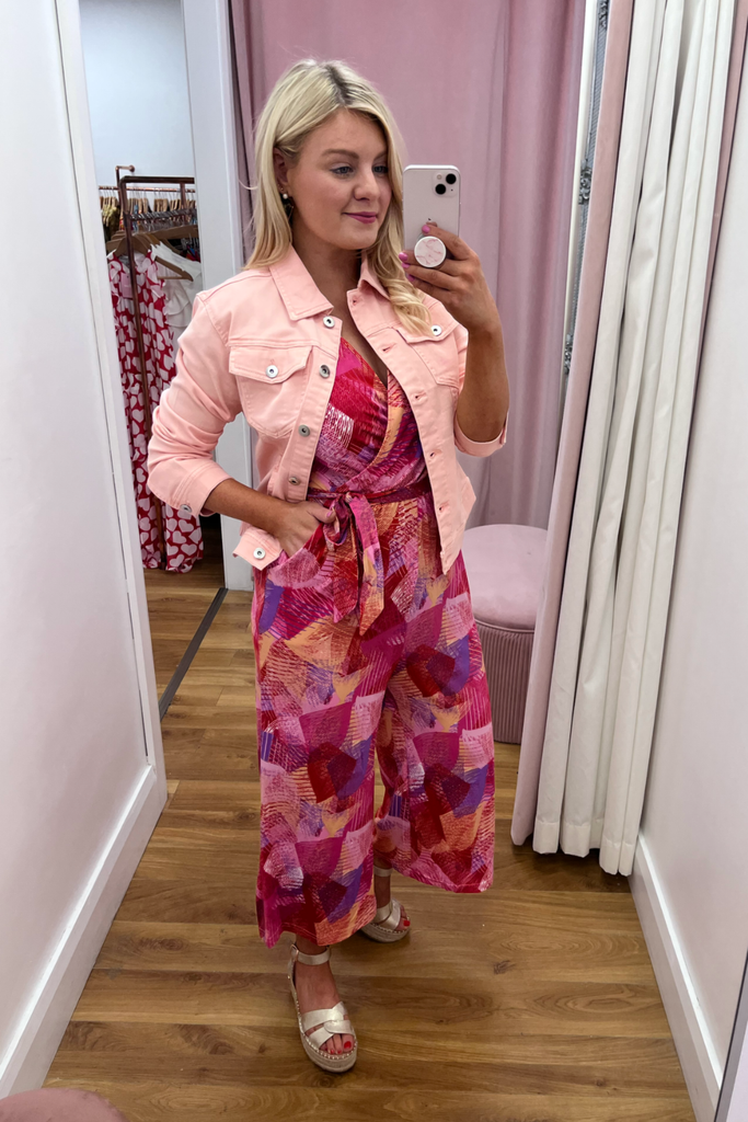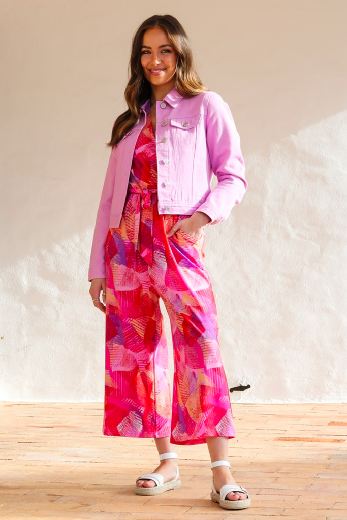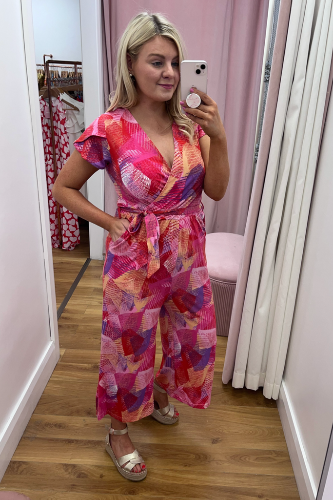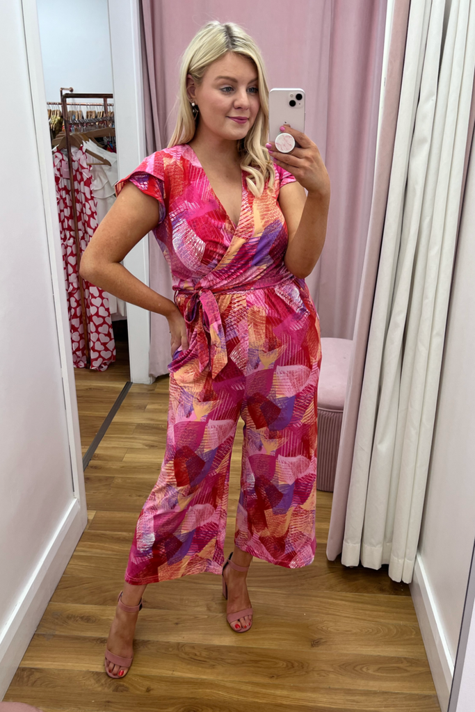 Pink and red floral jumpsuit with cropped wide leg, wrap style top and half sleeve. This style has a matching material belt.