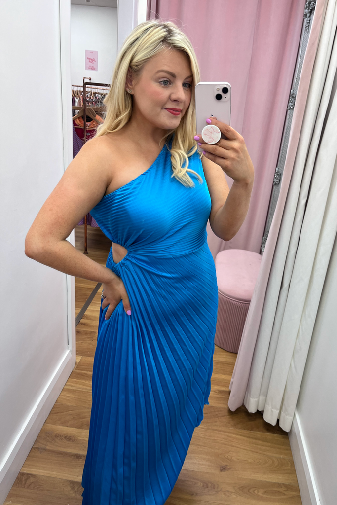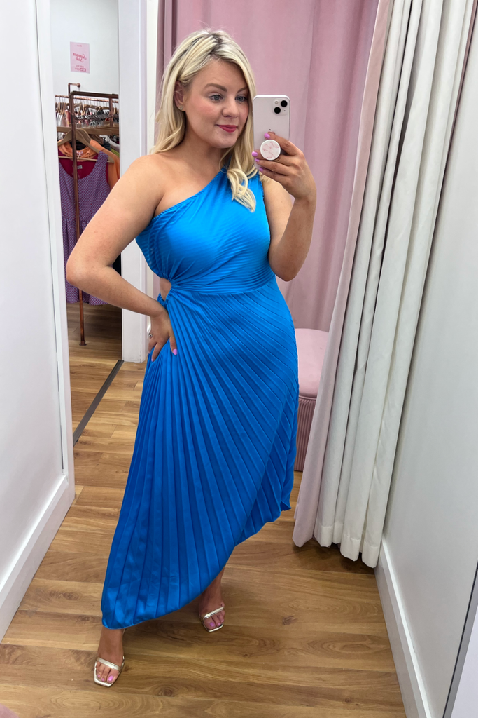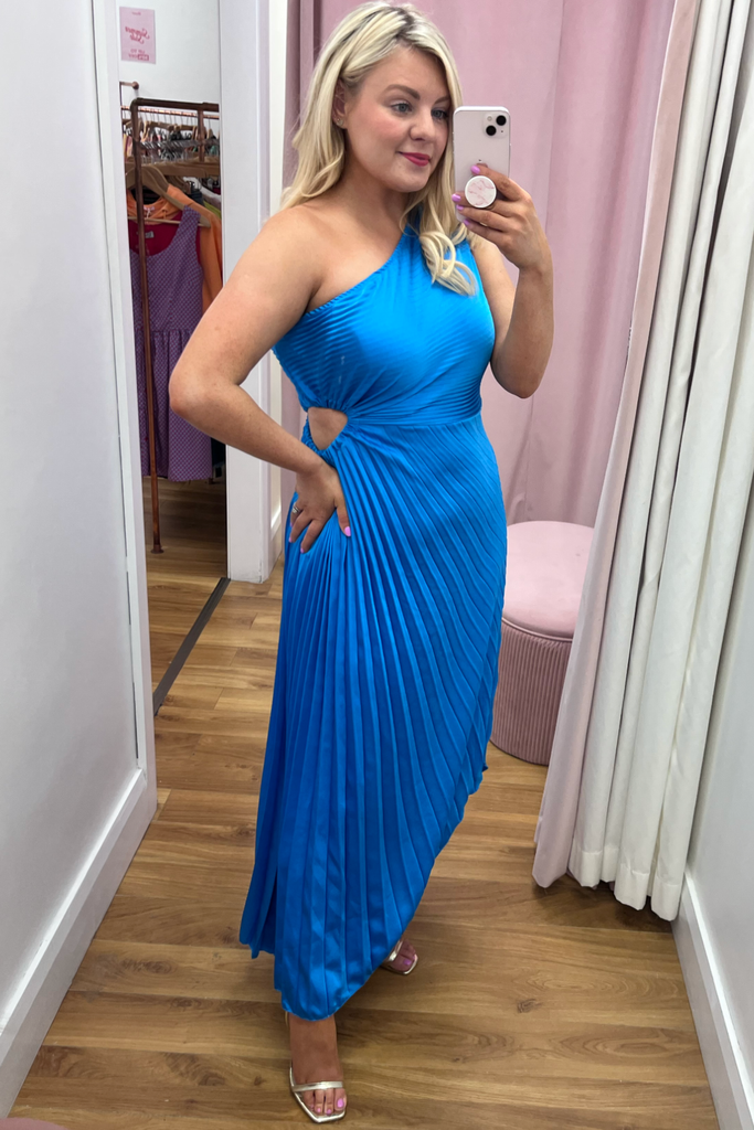 A show-stopper for your Summer occasions! This vibrant coloured dress features a dramatic one shoulder silhouette in an asymmetric style with pleats, and with cut out detail on the waist to add some drama!