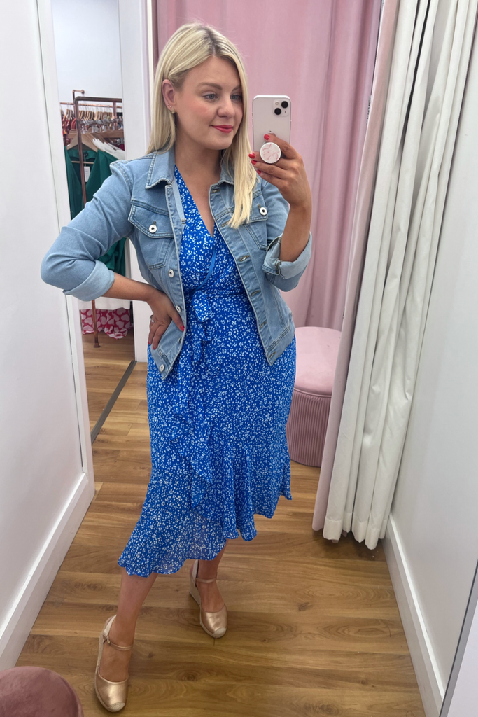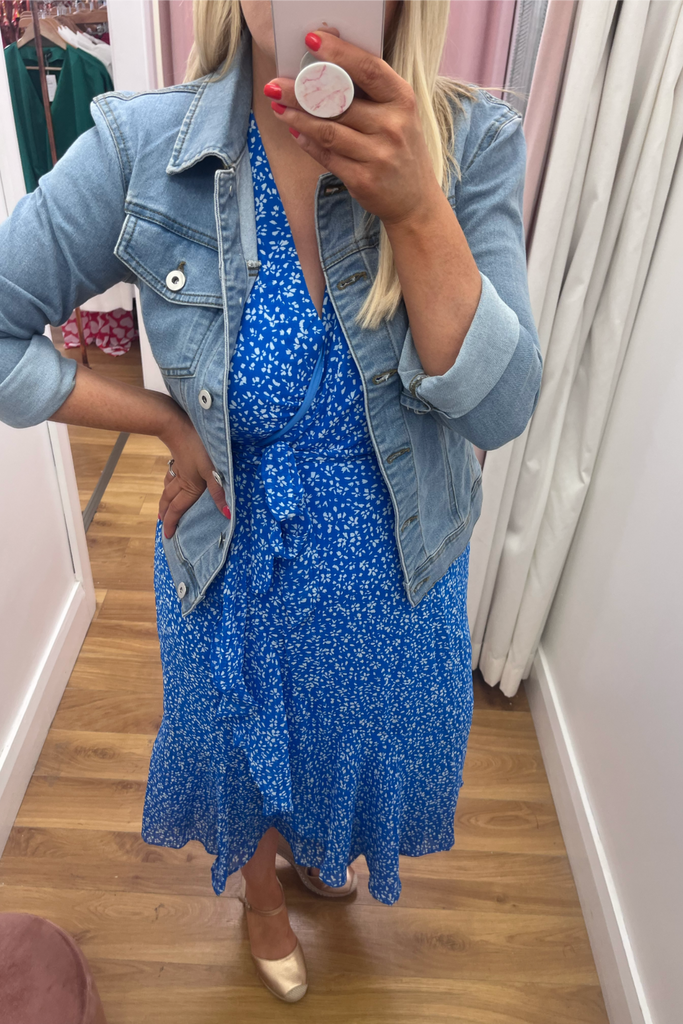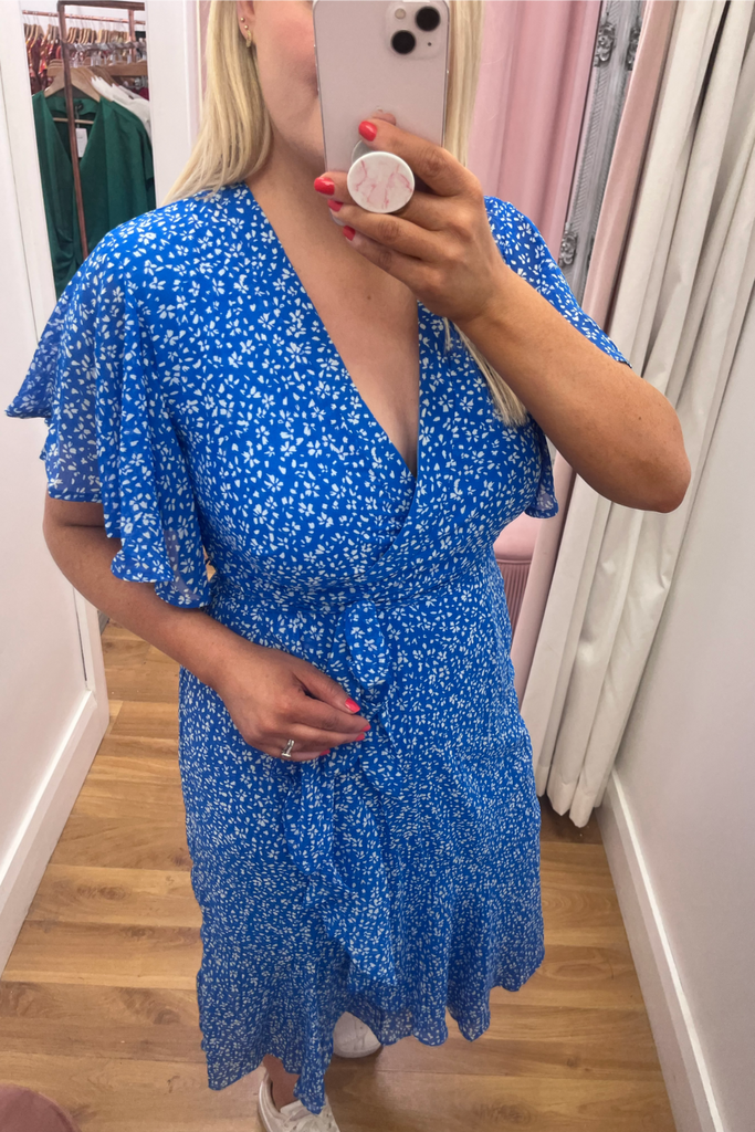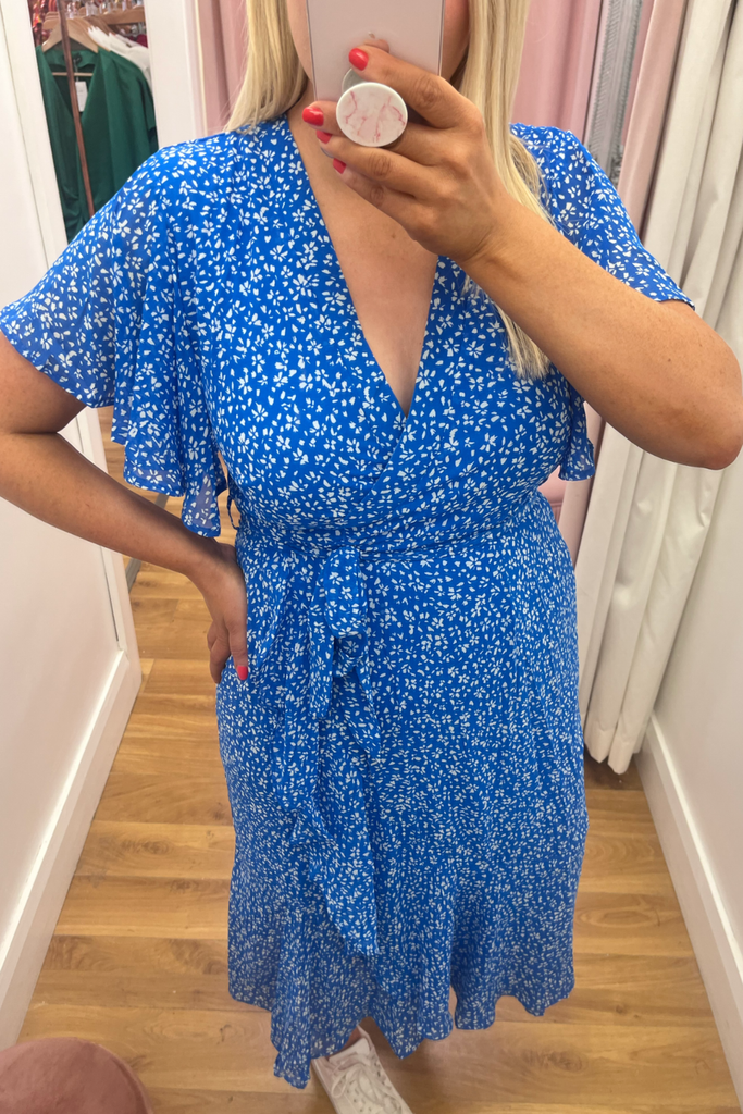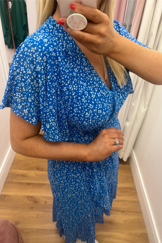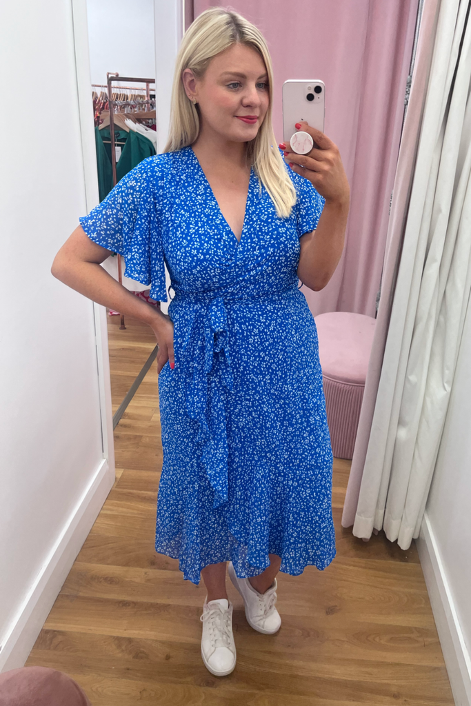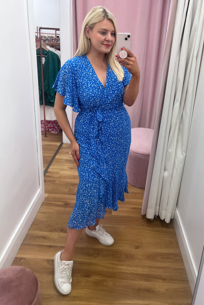 In a striking blue, this chiffon midi dress has a pretty floral print and statement but feminine ruffle sleeves.  The neckline is a wrap-style and the skirt is sewn in place but has the look of a wrap skirt. Features a cascading waterfall hemline on the wrap style skirt, and material tie belt. It fastens to the back with a zip