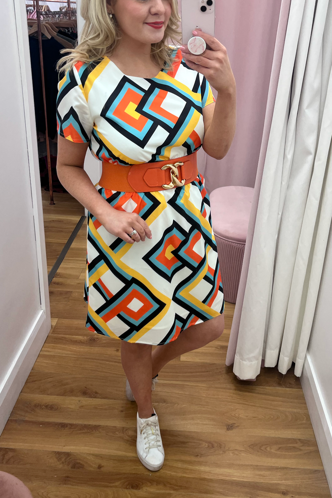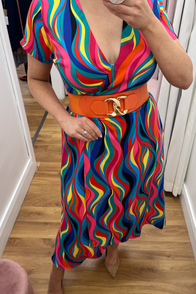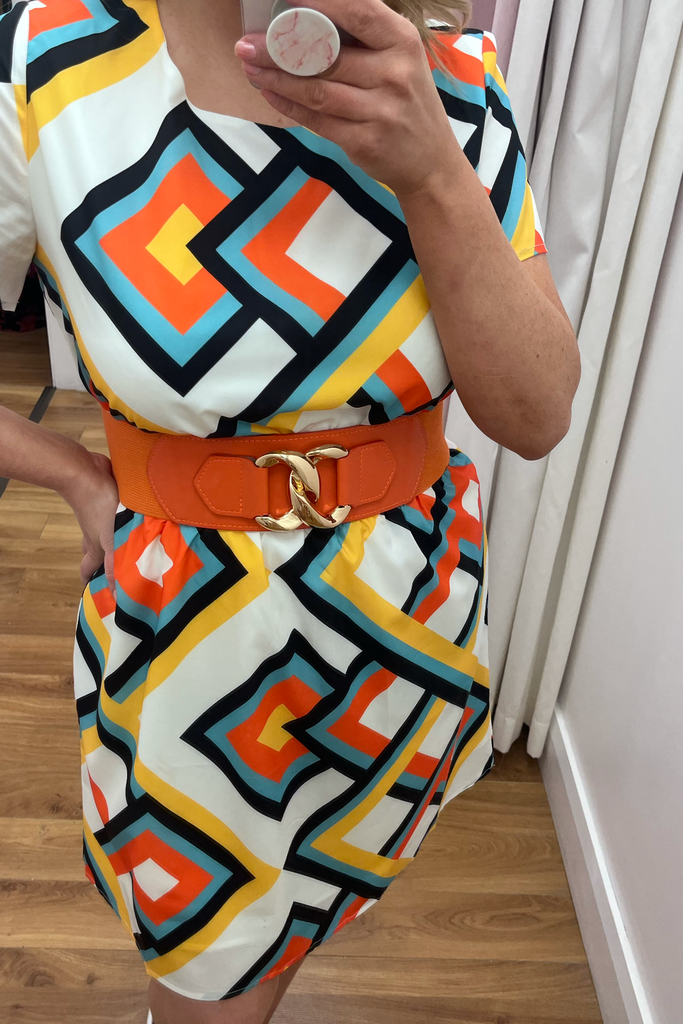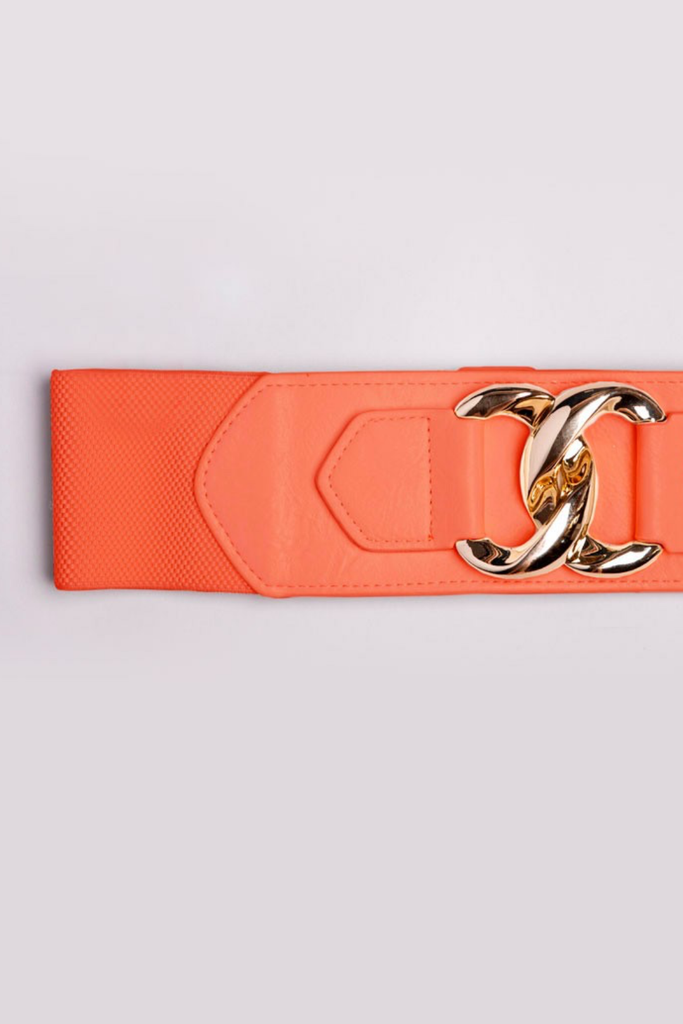 Broad vibrant orange belt with gold statement buckle detail. Fastens to the back with double poppers.