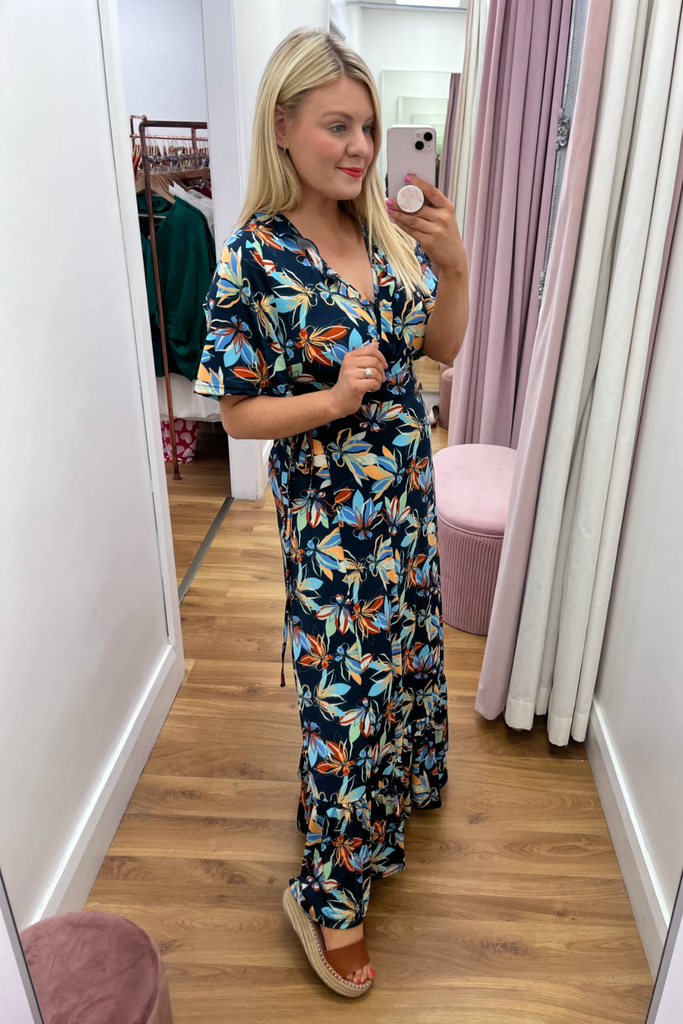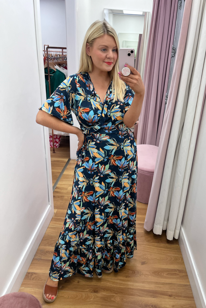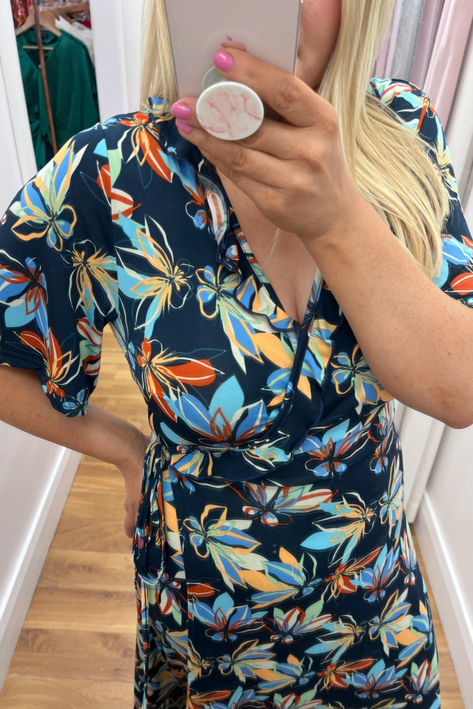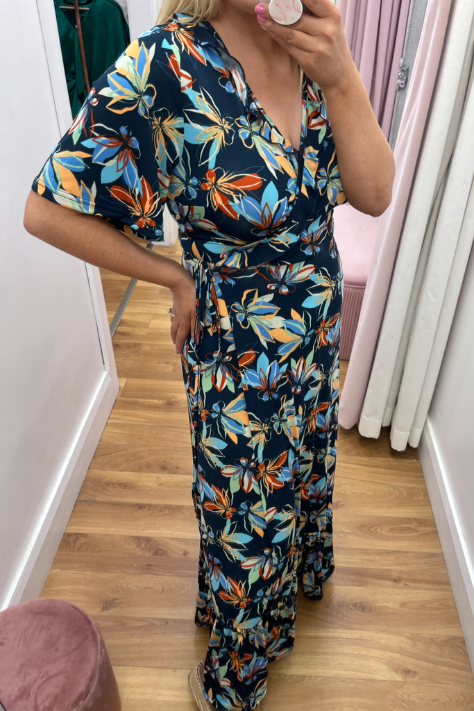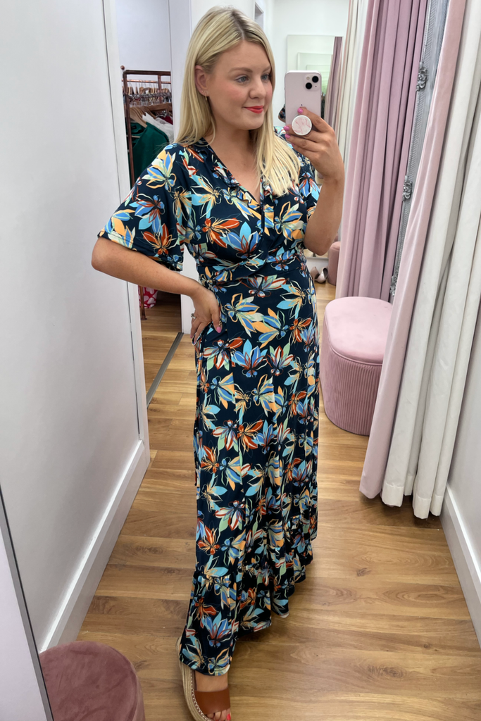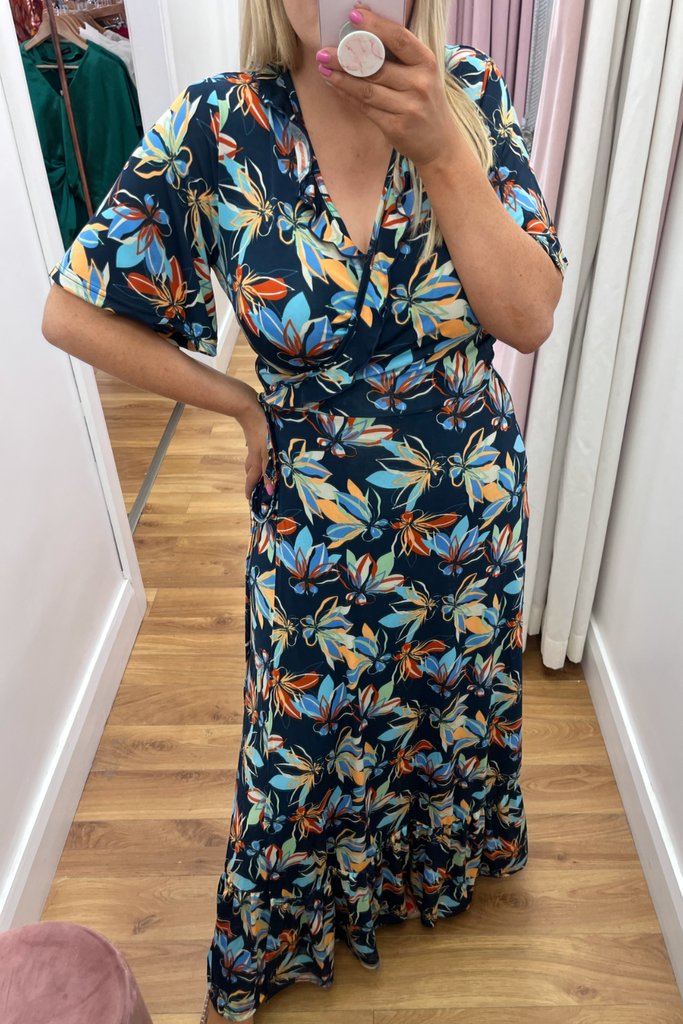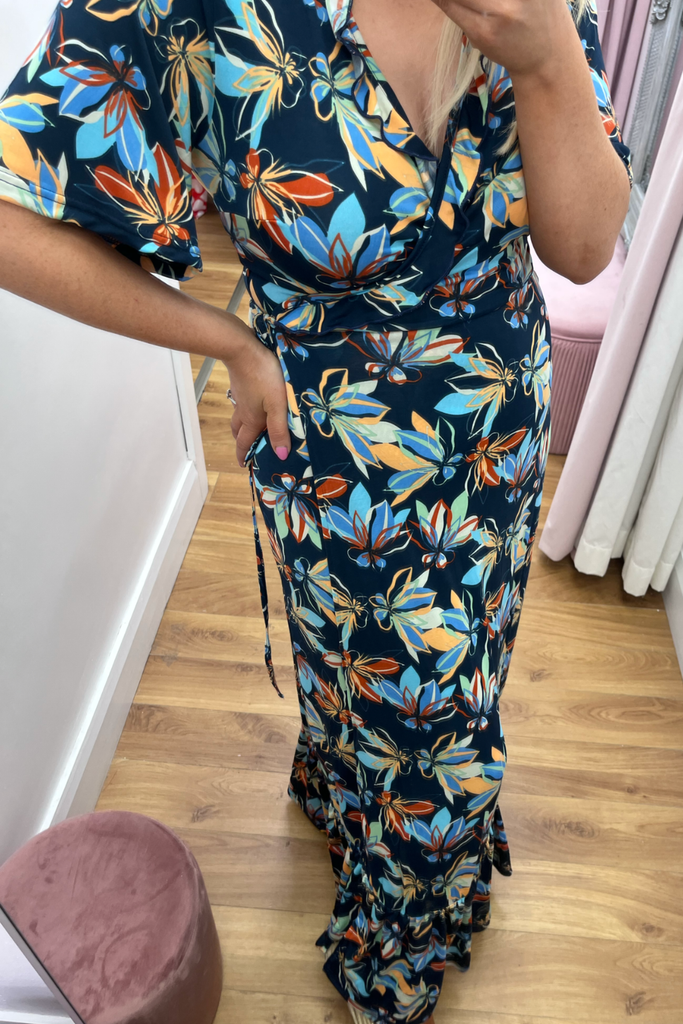 Wrap maxi length dress with frill detail along the chest and hemline and half sleeve. In a mix of blues, green and orange on a navy background. It has great stretch, comfort and amazing shape!