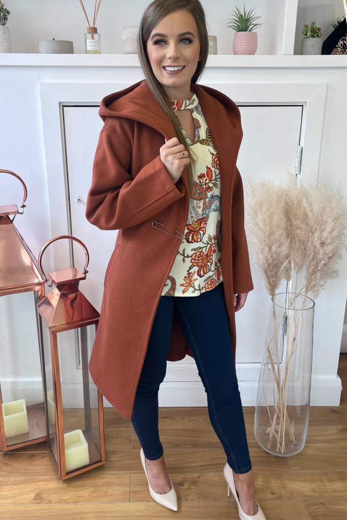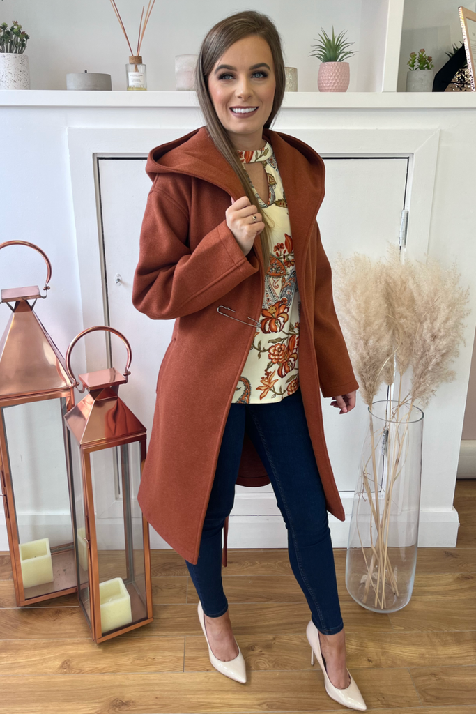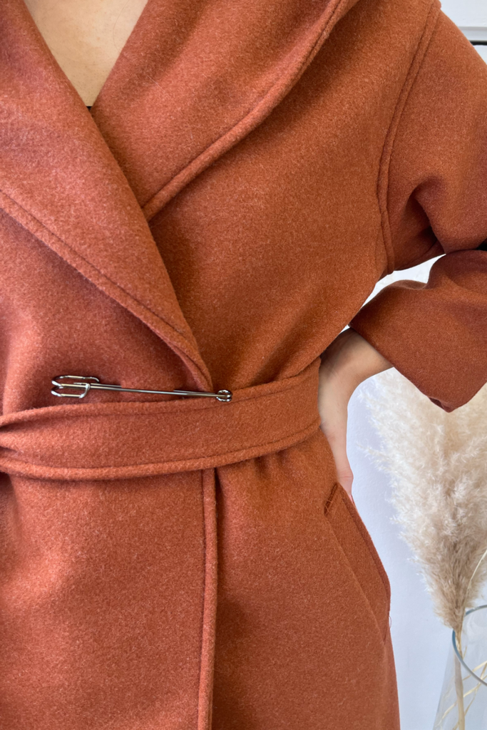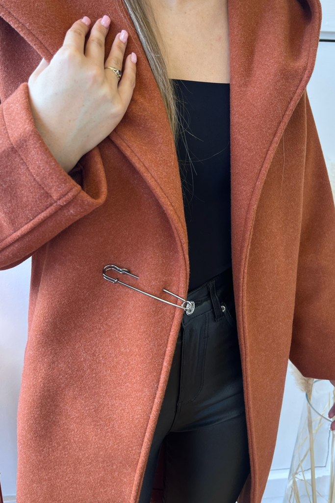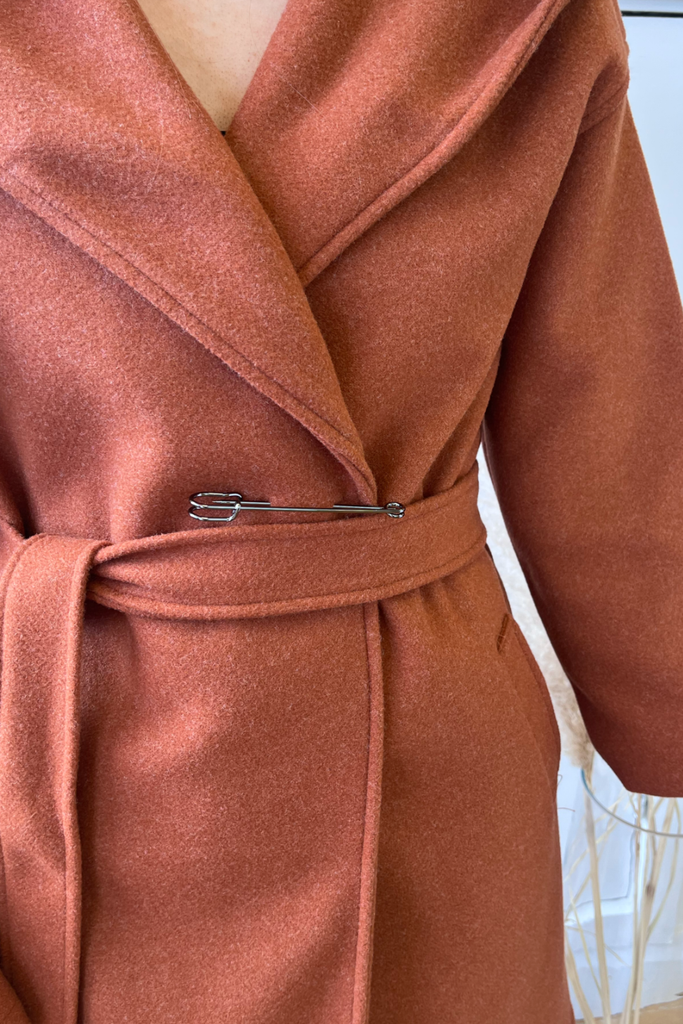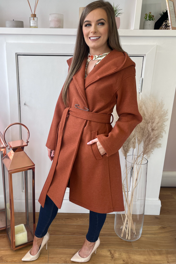 In a luxurious heavy weight, this wrap style coat is the perfect everyday to dressy coat. With hood, pockets and tie belt, with a decorative pin accessory at the front.